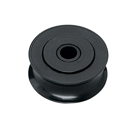 A self-contained Delrin sheave with Delrin bearings designed for use in custom applications, including the Hobie 16. Scored for rope (i.e. not suitable for wire applications).